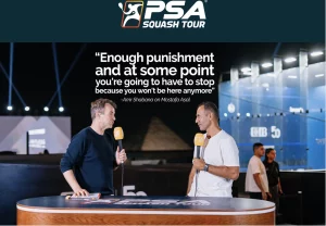 Michael Absalom showed no reticence in asking the big questions. Joined by pundits Joey Barrington, Lisa Aitken, and Saurav Ghosal – alongside guests, referee John Massarella and 4x World Champion Amr Shabana. Catch the full show now on SQUASHTV to hear the complete debate. |